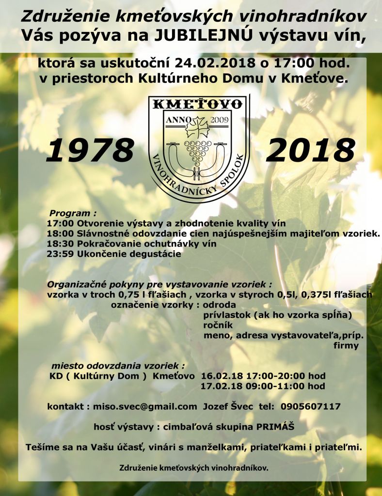 Marián Vaško, Marian Max, Združenie novianskych vinohradníkov, Kontajner a Vladimír Sládeček poskytli vzorky vín a my sme ich boli degustovať spolu s priateľmi z OZ Vínne hody vo Vieske nad Žitavou. Kmeťovskí vinohradníci oslavovali 40. výročie vzniku ich spolku a organizovania výstav.