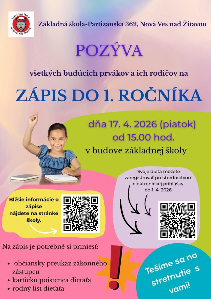 Pozývame budúcich prváčikov na zápis do základnej školy 17. apríla 2026 od 15,00 hod.
